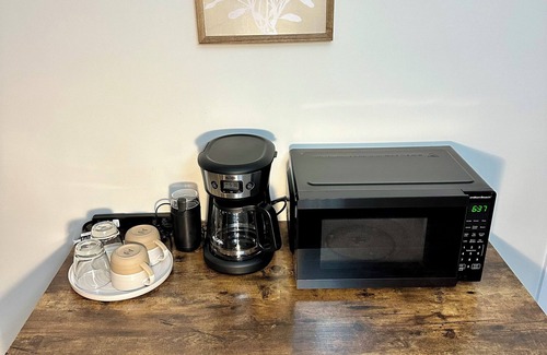 Whether you're here for a quick getaway or an extended stay, you'll appreciate the inviting layout, which includes a queen-sized bed, a leather sleeper sofa (with an additional queen bed inside), a dining table, and a cozy patio table on the private back porch—perfect for outdoor meals or enjoying the peaceful surroundings. The mini fridge, microwave, coffee maker, and coffee grinder make it easy to prepare snacks or a morning brew before you head out to explore.