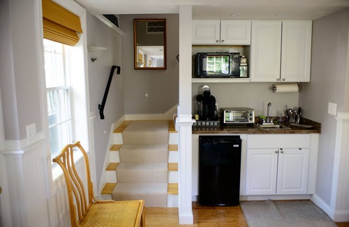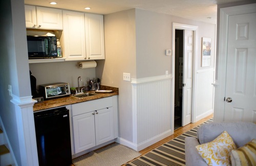 Chestnut Sweet, a two-floor townhouse-style apartment, is located in its own building in one of Marblehead's historic neighborhoods, called the Shipyard. Ideal for two adults (or for a couple and one guest), the Sweet is quiet and private, a gentle, fireplaced respite from your day's activities: swimming at nearby beaches, playing tennis and pickleball, sailing, shopping, and dining in town, and enjoying Marblehead's rich history. Everything is within easy walking distance. The Sweet features, on its first floor, a sitting room on the garden with a convertible love seat (to a double guest bed if needed0 and large closet; a living room with flatscreen TV and gas fireplace; a kitchenette (coffeemaker, countertop oven (we are not zoned for a full-size stove), microwave, electric kettle, and small fridge; full bath with rain shower, laundry facilities, and easy, private ground-floor access. Its second floor offers a queen bed, half-bath, skylights, ceiling fan, large bureau, and closet. The Sweet has full AC, plus wonderful sound-proofing throughout, making it a truly relaxing and private get-away space. Guests will have bikes, beach chairs, and beach towels to use, and a pair of congenial hosts who are available 24/7.