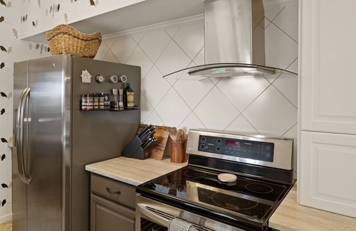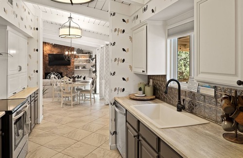 Come inside to a sun-filled split level great room that beckons you to relax and unwind. This stunning space features a plush sectional sofa, a natural stone fireplace, a Smart TV, and two dining tables for entertaining at home. The modern kitchen, with all new stainless appliances, makes home cooking easy, and a dedicated office space tucked off the kitchen provides a quiet corner to catch up on work or plan your next adventure. When the weather is fine, you’ll want to go outside for barbeques in the immaculately landscaped backyard!