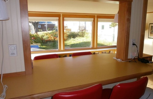 If you want to stay inside, you’ll find retro charm and modern comfort. A wood-fired stove warms the living room, next to a sofa and two easy chairs and a bookcase full of everything from mysteries to classics. There’s even a piano for the musically inclined. One bedroom features a queen bed, the second, a king, four-poster bed, mood lighting and a faux fireplace for warmth and atmosphere. There's also a fold-out double in the den, so the house sleeps a total of six. The dining area seats 6 to 8, or head into the kitchen and enjoy the great view from the retro bar. The kitchen is fully equipped for cooking and entertaining, including a microwave. And beyond that, the den opens up on an incredible view through four large picture windows. Enjoy the sight of Cape Perpetua as the sun sinks toward the sea. Relax in the cozy sofa or armchair and watch TV or one of the many DVD’s on hand. There are plenty of board games and puzzles in the den as well. The bathroom is also fully remodeled with a roomy, tiled shower and bath tub (and a great shower head!).
