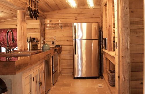 Comfortably blending modern conveniences, including free wifi, with quaint, historic charm, the bungalow is clean and minimally decorated with rustic tree posts, wood clad walls, pretty quilts from Sundance, warm wool blankets from a local sheep farm, and an adorable wood burning stove. We were happily able to save the original wood floors in most rooms.