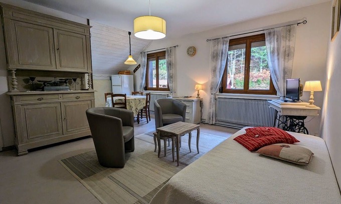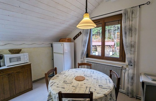 Shops: bakery and supermarket 2 km away. Town of Remiremont 6 km away (Venetian Carnival in Remiremont, every year in March). Gîte on the 2nd floor of the owner's house. Living room/living room with TV, open to the kitchen area (microwave, mini oven, mini dishwasher). 1 bedroom (1 double bed). Bathroom with shower. WC. Oil and wood central heating.