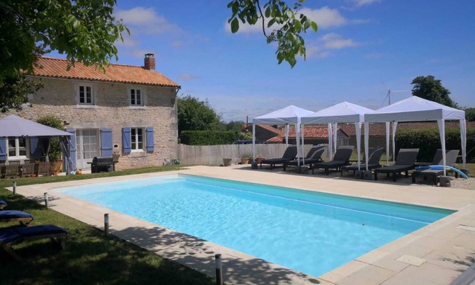 Charming restored farmhouse with large garden and pool is located in Nanteuil-en-Vallee. Charming restored farmhouse with large garden and pool provides accommodation, featuring Pool, TV, Bedding/Linens, among other amenities. This Other features Pool, TV, Bedding/Linens, to make your stay a comfortable one.
