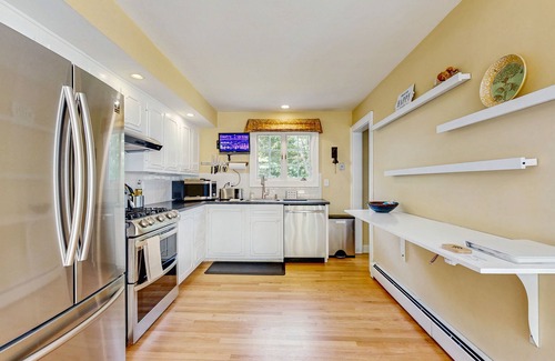Designed with comfort and relaxation in mind, this dog-friendly retreat offers cozy living spaces, a fully equipped kitchen with modern appliances, and plenty of room for families to enjoy. The well-equipped kitchen includes a KitchenAid mixer, heavy-bottomed cook’s pans, baking pans, a rice maker, a blender, and a Ninja coffee maker that uses both ground coffee and pods (stocked when possible). Feel free to poke around the cabinets and use what you find—the kitchen is also stocked with spices, coffee, tea, and some staples.
