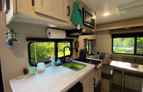 Trailer includes outside patio space with awning, built in sound system, AC/heater, microwave and gas stove. On property we have a small play set for kids, fire pit, river access, wildlife watching and more.