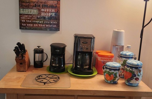 The lower level features a private bedroom, additional full bath with both shower and clawfoot tub, and a cozy family room with fireplace—plus sleeping space for more guests with two full-sized futons. With multiple ways to use the space, the full house can sleep up to 10 people.