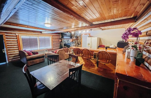 The duplex cabin sleeps 6 with 3 Queen Beds, and has a full kitchen with a countertop stove, full-size refrigerator, microwave, dishes, pots/pans, utensils, coffee maker, toaster, granite countertops and bar. Living room has a cozy river rock fireplace. Bedroom 1 has 1 queen bed and bedroom 2 has 2 queen beds. Living room has a sofa bed as well if needed. Full bathroom with a tub/shower, & a separate granite top vanity sink. It also has a washer/dryer.