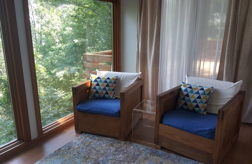 We LOVE the peace, quiet and views of our cabin on the river. It sits high on a wooded bluff; the river is not accessible from our location. Please do not venture down to the river edge of the property; the ground is sandy and will give way. Our cabin is not available for groups of more than six. Sorry, amenities located within our neighborhood are for owner use only.