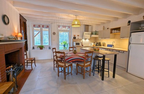 Outdoors: 1.5-hectare private unfenced garden, 80m² private enclosed courtyard, garden furniture, plancha, pétanque, basketball hoop, and ping-pong. Rowboat and boots are available. Garage for 2 vehicles and parking. The cottage is housed in an old mill where water is omnipresent; the site requires caution and parental supervision for children. At the end of a path, the old mill surrounded by water is ideal for gatherings of friends and family. Independent and not overlooked, only the birds will disturb the tranquility of the place. David wanted to preserve the authenticity of the place with rustic and vintage decor in certain rooms.