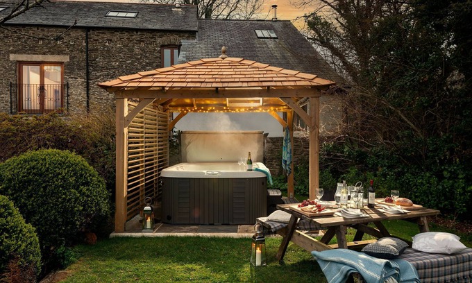 The private gardens have lawns and beds stocked with trees and shrubs, garden chairs, tables, a parasol and a picnic bench, as well as a charcoal BBQ. Perfect places to enjoy a morning coffee or to enjoy the late afternoon sunshine with a glass of wine! The hot tub with rural views is covered by a wooden gazebo, so you can enjoy even in the rain! A perfect place to relax - maybe after a day walking, exploring or surfing. We ask that you bring your own swimming towels.