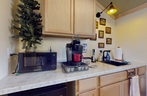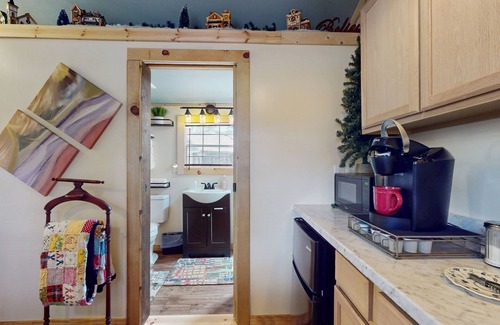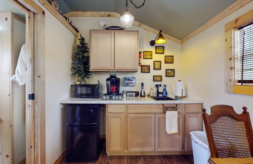 This festive cabin boasts a well-equipped kitchenette with a mini-fridge, a microwave, and a Keurig coffee maker - you can still prepare simple and delicious meals with some creativity and treat yourself to delicious coffee cups every single morning. The smart TV allows you to stay up to date with your favorite series during your stay, however, please keep in mind you must use your own credentials to stream. The cabin also offers a full bathroom, a beautiful wooden porch, free WiFi, and a space heater!