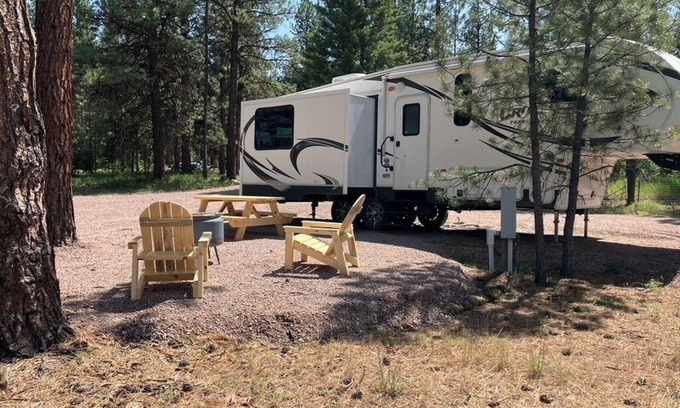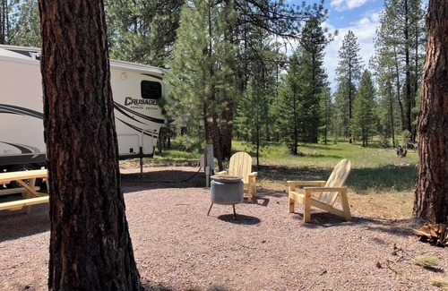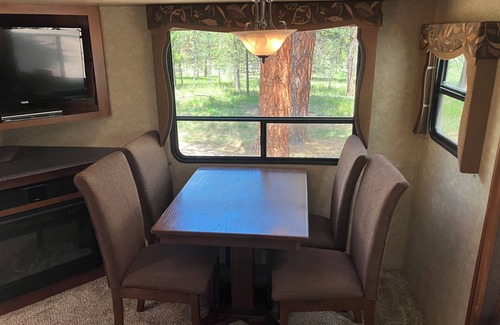 Tucked along the wooded edge of a mountain meadow, this luxury fifth-wheel glamper is your perfect escape into nature—with all the comforts of home.
