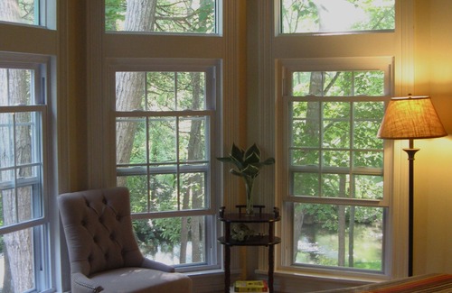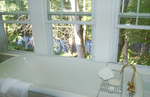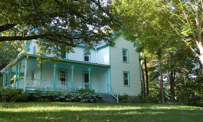 The Accommodations : The 1910 restored and updated Victorian Farmhouse and cottage are located on a 7 acre peninsula. It features a large porch on two sides with rockers facing the gardens and the 4 acre manicured lawn on the bottom land where the vegetable, herb garden, and berry patch are located. The grassy lawn is suitable for a variety of sports activities from frisbee golf, and croquet, to touch football. On the creek side of the Farmhouse is a multi level deck with built in benches, a gas grill, with a beautiful long view of Reed Creek all conveniently located off the kitchen an arrangement ideally suited for enjoyable outdoor meals. The cottage which we call the 'Sugar Shack' is located next to the Farmhouse with a queen bed, full bath, it's own private deck, propane grill, mini fridge, and is ideal for a couple. With 4 bedrooms and 2 1/2 bedrooms in the Farmhouse, and a bedroom and full bath in the Cottage. There are 4 queens and 1 king sized beds providing comfortable accommodations for 10.