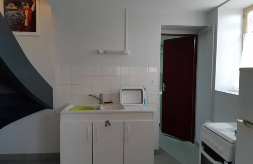 Ground floor: kitchen integrated into the living room. Wood-burning stove. Bathroom (shower/toilet).