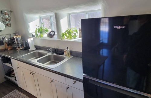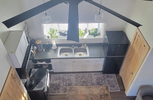 Welcome to Second Cut, a cozy 450 sq. ft. cottage perfect for a romantic getaway, ski vacation, summer mountain biking, hockey tournaments, or a peaceful escape to the Northeast Kingdom. Though compact, this tiny house offers comfort and charm with a tall cathedral ceiling, oversized ceiling fan, and open-concept living. The main space features a dining nook, full kitchen, and sitting area with a queen sleeper sofa and 40” TV (streaming ready). A loft, accessed by a steep but manageable ladder, offers a quaint queen sleeping area with decorative tile flooring and a view of the attractive architecture, craftsmanship, and style below. A small bedroom with a twin bed connects to a 3/4 bath with a high chandelier and spacious tiled shower. Guests rave about its charm and call it the ultimate cozy retreat!