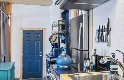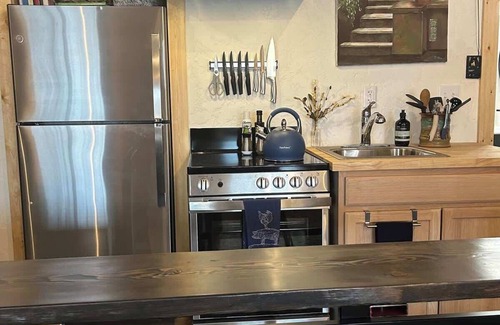 In our newly renovated studio garage apartment you will find a comfortable queen bed, a sofa bed with extra linens, a walk in shower, stocked kitchen, washer/dryer, and a cozy bright living room. A pack-n-play is always available with sheets and a blanket, the unit is not child proof. Lets not forget the patio that has seating, propane firepit, and a gas grill.