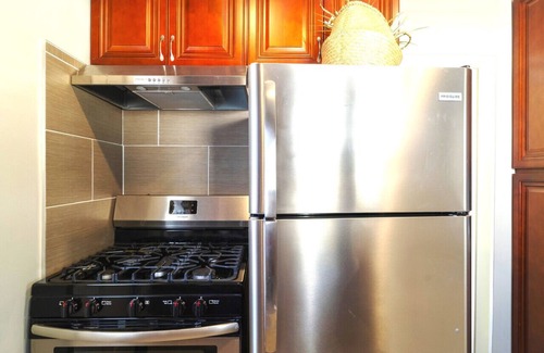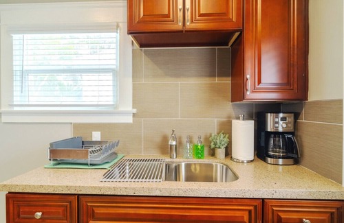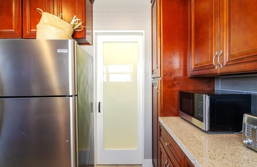 The Charming Studio Balboa Park pampers with luxurious granite countertops, a fully-equipped kitchen, a sumptuous king-sized bed, and a tiled shower with a rejuvenating rain fixture. Indulge in leisure time with a chic wall-mounted flat-screen TV featuring a curated selection on Netflix, complemented by complimentary high-speed Wifi. What's more, revel in the added convenience of private in-unit laundry.
