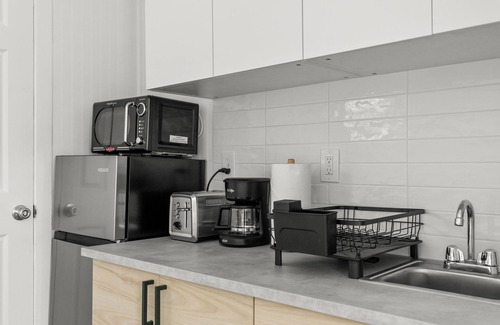 ✔ Small kitchenette (no cooktop, no dishwasher) for basic meal prep, including a toaster, microwave, drip coffee maker, tea kettle, small fridge, plates, glasses, and silverware