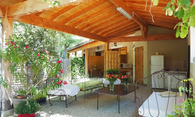 On the ground floor: living room with kitchenette (2 hotplates, sink, fridge, dishes, coffee maker and kettle, washing machine); 1 sofa bed for 2 people (with duvet), table with 4 chairs, bathroom with walk-in shower, sink, toilet, towel dryer, TV and wifi access. (hot water served by a solar water heater, 500 L). A mezzanine with 2 single beds (with duvet), tables and bedside lamps, storage cabinet. Small terrace in front of the studios. Outdoor sitting area under roof with sink and freezer.