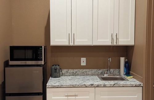 Escape to this enchanting studio in picturesque Clovis. This cozy retreat features 1 queen bed, a private bathroom with a shower, heating, and AC and Kitchenette. Guests will find comfort and tranquility in this quaint space. Enjoy your time in Clovis at our peaceful studio.