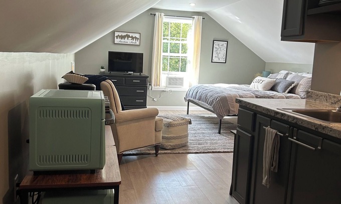 Nestled in a quiet neighborhood, with beautiful mountain views. Our cozy studio is perfect for a relaxing getaway. Guests will enjoy a king size bed, small living area and functional kitchenette. There is a full bath with stall shower, toilet, sink and storage cupboard. Our studio is stocked with towels, linens, shampoo and soaps to ensuring you have everything you need during your stay. You're sure to make fantastic memories with a stay at our place. *host on sight. Complete separation of spaces. *Outside security cameras for everyone’s safety. *Contactless check in