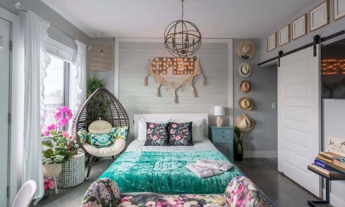 Revel in the Instaworthy charisma of this charming studio boasting vibrant, nature-themed décor. Perfect for a romantic getaway, this luxe apartment with a private deck is just a few steps from local hot spots like Bare Bones Butcher, Fat Bottom Brewing, and Pepperfire Hot Chicken. A short 3-minute drive takes you to endless options in Sylvan Park, including the famous Hattie B's. With a 10-17 minute drive downtown costing roughly $10-15 or less with Uber/Lyft, this apartment makes it easy to enjoy your much-needed vacation!