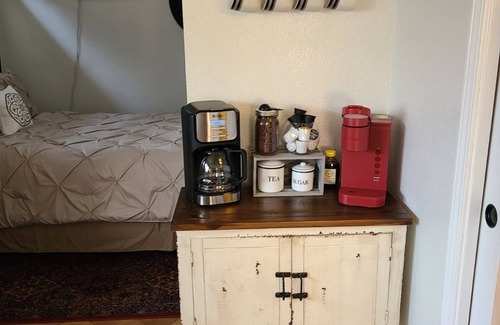 Plenty of parking for large vehicles and trailers on the property. This 3 room suite is situated on an acre lot with plenty of space to relax. Garden view out of the front bay window in the eating area. Separate room with a sofa and TV, the third room is the bedroom with wardrobe. The kitchenette has a coffee maker, refrigerator/freezer, toaster, microwave, and induction cooktop.