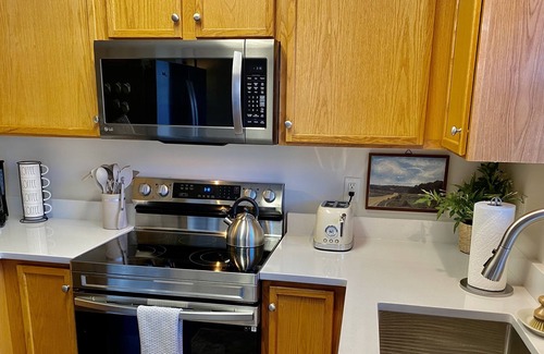 At the property you are provided two free reserved parking spaces in front of the unit, plenty of sidewalks for casual strolls and a pool (when in season). Bring just your suitcase and toiletries, we have the rest covered, with a fully equipped kitchen, king bed suite, coffee, hot teas and in-unit washer and dryer. The downstairs living area has a smart tv, plush furniture, board games and magazines to lounge with.