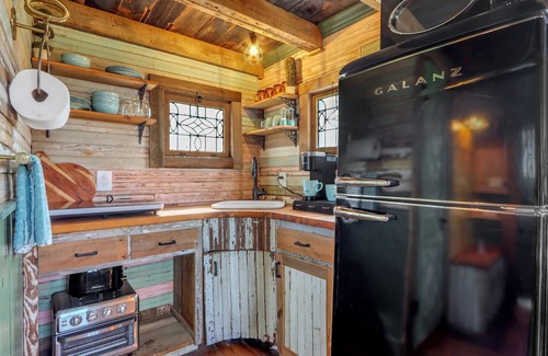 On the main level, the open living area is both stylish and welcoming, featuring a plush, colorful sofa that adds a playful pop to the rustic boho décor. The walls are adorned with reclaimed wood, beadboard accents, and thoughtfully selected wallpaper, creating a warm and inviting atmosphere. The intimate dining space is ideal for two, offering the perfect spot to enjoy a morning cup of coffee or a quiet dinner.