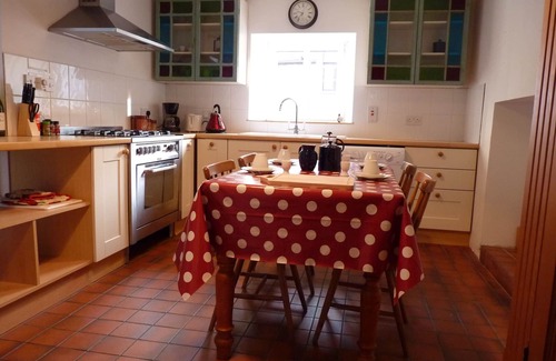 On the Ground floor, past the original hallway with traditional features, a comfortable living room with Sofa and chairs that opens into a separate dining room with large dining table. The separate kitchen includes all facilities (including washing-machine) and you can also use it as your breakfast room as it has another kitchen table!