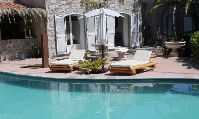 Superb villa located 10 minutes from the sea, completely renovated in 2015, it consists of 3 bedrooms, 2 of which are parental suites, 2 Italian-style shower rooms and a bathroom and 3 toilets, fully equipped kitchen, large living space ( living room, dining room) internet access in a magnificent park of 3000 m2 (palm trees, olive trees, oaks, fruit trees), private swimming pool13. 5x6, jacuzzi, patio with outdoor kitchen, plancha