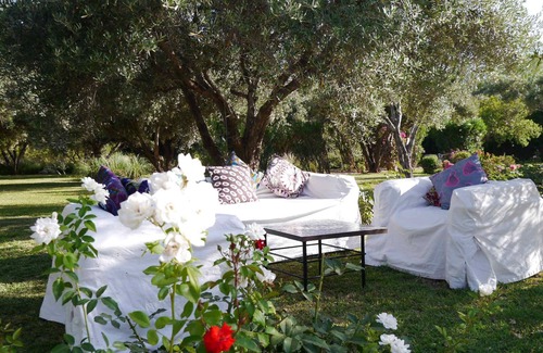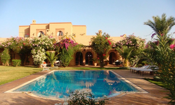 Dar Salma is surrounded by a beautiful garden of one hectare planted with olive trees, date palms, phoenix palms, lemon trees, orange trees and other fruit trees. A beautiful infinity pool of 12 mx 8m is also available to guests. The property consists of a main villa for 6 people and a small adjoining villa, connected by a pergola with flowers for 4 people for a maximum capacity of 10 guests. The reservation of the property is totally exclusive. Each room has a private bathroom and a fireplace. The air - conditioned ensemble is decorated in a Moroccan artisan spirit (tadelakt with walls, ceilings and floors, some reed - roofs "Tataoui" and bathrooms in "Zelliges"). Totally private, the villa is maintained daily from 08H00 to 16H00 by two people and by a gardener. Our cook will be happy to prepare meals at your request and to make you discover the Moroccan gastronomy. Similarly, a Continental and Moroccan breakfast included in your rental will be served every day, consisting of jams "House" ', Moroccan crepes, pastries and freshly squeezed orange juice. There is also a petanque pitch and a table tennis table. Our villa is guarded by a nice dog, we can not accept other animals. Any festive event that may cause nuisance to the neighborhood can not be accepted.