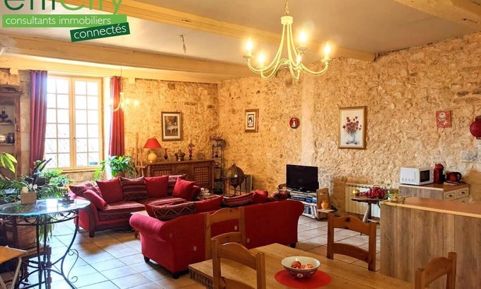 Posh furnishings in old stone villa house overlooking medieval plaza. 1.5 bathrooms . Monpazier plaza has restaurants, bakeries, groceries, tourist info and nearby museum. A great place for art retreats . Artist owner. Movie “The Duel” was filmed here in 2021. Available starting April 2022 after escrow closing.