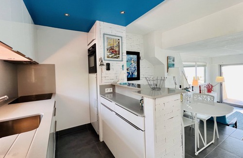 This semi-detached villa with refined decoration is very well equipped, it enjoys an exceptional view of the Mediterranean and is ideally located on the seafront between Collioure and Port-Vendres in a secure residence with 2 beautiful terraces always sunny of 30 m2 including one allowing direct access to the coves.