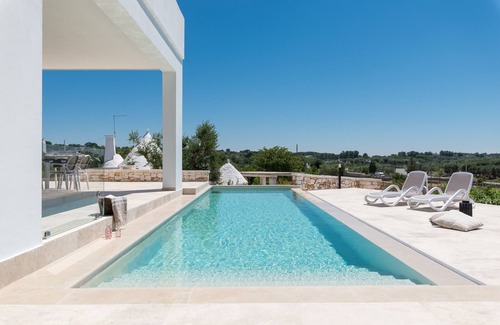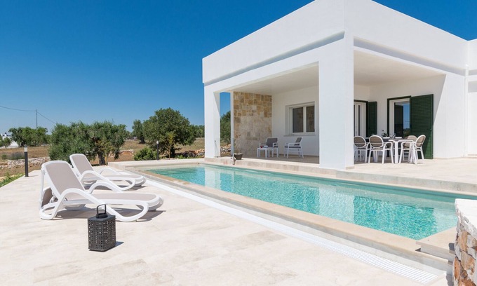 A stunning villa immersed in the countryside of the Itria Valley with panoramic views of vineyards and olive trees, for a dream holiday by the pool. Recently built, the villa features a large living area with a double sofa bed and a kitchen with access to the large veranda, where you can dine or have lunch, or just relax by the pool.2 bedrooms, one double with en suite bathroom and one twin and a second bathroom. The large window in the living area offers a unique landscape.This accommodation is the perfect solution for those seeking a relaxing holiday, far from the hustle and bustle of the city, while sharing some special moments with relatives and friends.Cot and high chair available upon request, at an extra cost of 35€ per stay, per item.*Upon arrival or a few days before arrival it may be required to pay a tourist tax, which varies according to local regulations. You will find your reservation details within the Guest Area of Wonderful Italy.Ostuni, known to the world as the White City, is the pearl of the Itria Valley. Its blindingly white, immense historic center culminates in the Cathedral (600 meters from the apartment) that soars over the plain of olive trees, the coastal dune park and a crystal-clear sea. Characteristic are its narrow streets, the Piazza della Libertà (5 minutes away) and the column of St. Oronzo that majestically protects the town.Its countryside stretches into the heart of the Itria Valley. A few kilometers away is Ceglie Messapica, a center of tradition and enogastronomy; Cisternino, a village recognized as one of the most beautiful in Italy; and Alberobello, whose famous trulli have been a world heritage site since 1996. About 30 km to the north we find the Archaeological Park of Egnatia, Monopoli and Polignano a Mare, ancient fishing villages with a charming historic center and beautiful beaches. To the north (80 km) we find Bari, the gateway to the East, while proceeding south we first encounter the Torre Guaceto nature reserve, then Brindisi to reach Lecce, the capital of Baroque. Moving westward there is Taranto, heart of Magna Graecia, and finally to Matera, characteristic for its sassi and European Capital of Culture 2019.Finally, the airports of Brindisi and Bari are just 1-hour drive away.