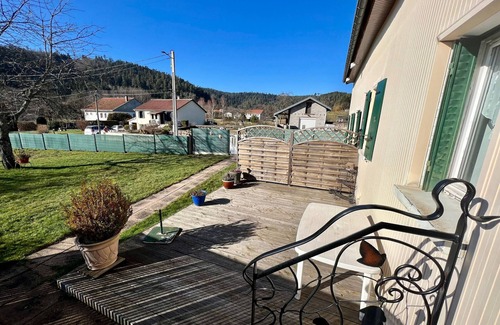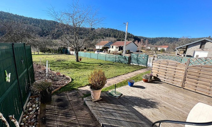 Gérardmer is 24 km away: lake, ski resort, hiking... Gîte with private entrance. Ground floor (access via 5 steps) and 1st floor: 1 mezzanine bedroom (1 double bed, 1 single bed, baby bed on request). Kitchen. Living room with sofa bed. Bathroom with shower. Toilet. Electric heating. Private terrace with access to a garden shared with the owners: garden furniture, deckchairs, and electric barbecue available. Garage available. Utilities included. Wi-Fi internet. Adjoining the owners' house.