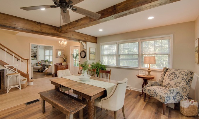 INDOOR LIVING: Smart TVs, board games, DVD player, books, ceiling fans, dining table, farmhouse decor, desk workspace, fireplace