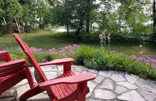 A stone patio, surrounded by flowers, provides the ideal spot for lakefront coffee or cocktails. The property also features a new dock on 150 feet of waterfront. A TV and internet are provided, but cell service can be spotty.<