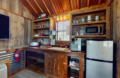 Nestled among the trees on 12 acres, this charming, water-view cabin is ready to be the perfect home base for your next adventures! You will get to experience Christmas every day here. This retreat is ideal for a writer's retreat, a couple's getaway, birdwatchers looking for painted buntings, and rock hounds. You are only seven miles away from the antique show at Rummel Square, which is part of Downtown Round Top. The city of Giddings is 11 miles away offering restaurants, a supermarket, and convenience stores.