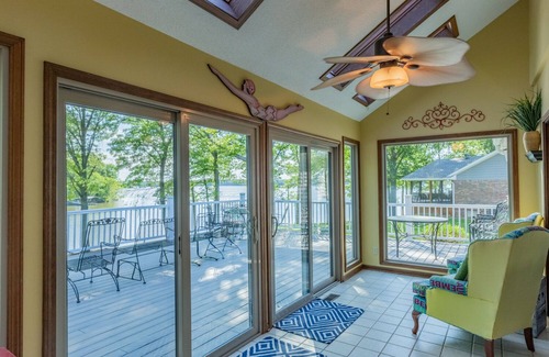 Enjoy the peaceful tranquility of lake life in this charming 4 bedroom and 2 1/2 bath house located right on the lake. Only 250 Yards from the main lake. This lake front property offers spectacular views, a gentle sloping manicured lot for easy access to the water for swimming and water sports. We also have a shared boat dock with a swim ladder. Features of the home include a beautiful all seasons room facing the lake, 55 inch TV with surround sound in the living room, and flat screen TV's in the bed rooms. Also included is cable TV, high speed wireless internet, linens, towels, washer/dryer, central H/A. Outside there is Traeger pellet smoker grill!. The new 1200 st ft deck faces the lake with plenty of seating for everyone to enjoy the views. The many windows across the back of this house frame the beautiful views no matter what the season. 4th Bedroom is furnished with 3 twin over full bunk beds, flat screen TV and NES Classic video game comptroller. The house will accommodate 4 adults and up to 6 children comfortably or up to 8 adults with no children. The house is 2 miles from Prizer Point Marina/restaurant. The Rock Castle public boat access is just across the cove. Enjoy lake living at in the amazingly cozy lake front home.