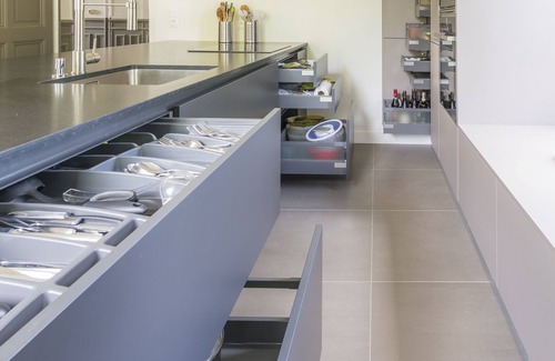 an equipped kitchen: washing machine, dishwasher, oven and stove.