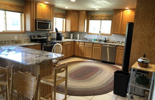 Our cabin includes a large open kitchen with stone counter tops and new appliances, 3 bedrooms that sleep 8 comfortably. Large covered deck with a gas grill. In cold weather warm up around the wood stove. Great spot for families, small group, or a couples weekend.