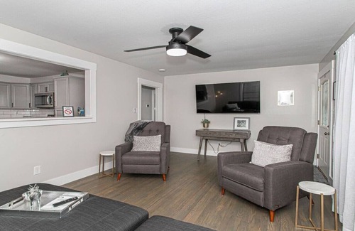 As you step into the kitchen guests will have a full use kitchen with newly renovated features as well as design. The kitchen layout is shared with the laundry nook to the right of the fridge. The living room and bedrooms is set up with plush gray furniture, bedding and neutral tones to give you a relaxing stay.
