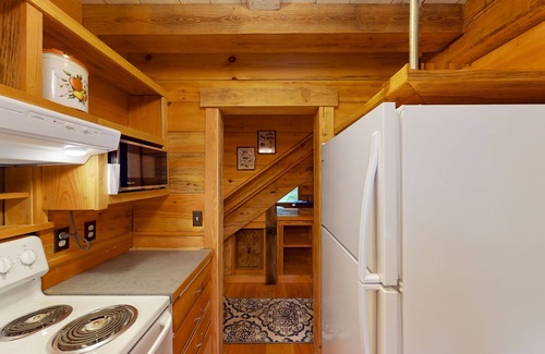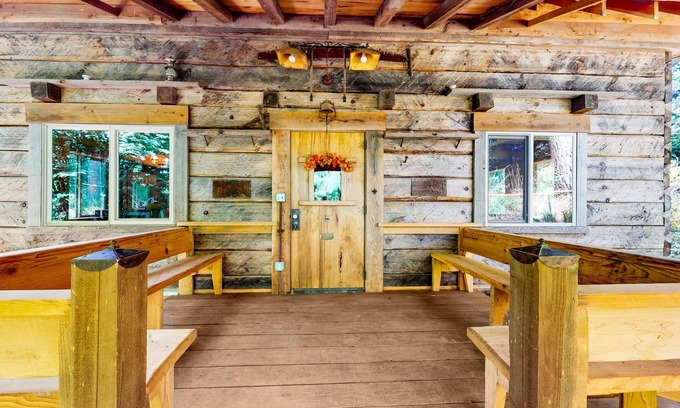 Covered porches adorn both sides of the cottage, providing the perfect spot to sip your morning coffee and watch your kids play in the wildflower lawn. The interior is a showcase of timber craftsmanship, from the charming built-ins to the exposed rafters. Enjoy a well-equipped kitchen, a window side dining space, and a living room where you can snuggle up with a good movie and a view of the woods.