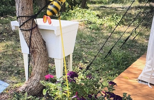 EQUIPPED WITH: Queen memory foam bed, Mattress protector, Nightstands, Solar lights, Carpet inside the tent, Solar shower and sink station, Small portable potty system created by NASA, Great cell service, Picnic table, Adirondack chairs on the Deck, Outdoor twinkle lights, Fire pit, Firewood.