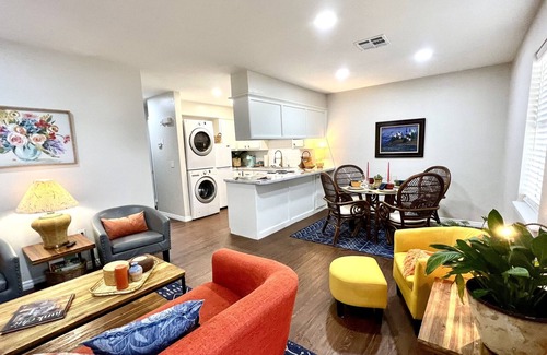 Colorful, cozy, and quiet! This space features a comfortable living area and dedicated dining area that easily seats four guests. Watch a movie on the 50" smart TV or cook a simple meal in the galley kitchen which is fully stocked with all your basic cooking utensils. Feel free to wash your travel clothes in the full sized washer and dryer and then wash yourself off in the full bath which is centrally located to both bedrooms. Slip between clean sheets of a queen sized bed and park your belongings in the closet. The private backyard is perfect for taking in the Oklahoma morning air and sipping on a freshly brewed cup of coffee. Come back soon!