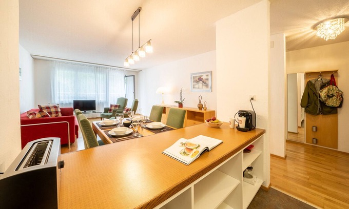 Vacation in Vulpera means relaxation in a quiet district of Scuol, a typical Engadine location, surrounded by sgraffito-decorated houses, the Swiss National Park, near the golf course, a beautiful old park, right next to a magnificent Art Nouveau outdoor pool, close to the Gurlaina ice rink and a bike and bathing offer that is second to none.The location of the apartment is impressive due to its tranquility and short distance to the ski bus, which takes you to the valley station of the Motta Naluns mountain lifts in just a few minutes. The highlight of the apartment is the large south-facing balcony, which is equipped with a grill, table, and lounge chair/armchair. Within walking distance, there is a pizzeria with a wood-fired oven and the golf restaurant, which also welcomes outside guests. From the apartment, you have a wonderful view of the Lower Engadine mountain landscape and the Vulpera spa park.The approximately 65 m2 apartment is located on the 1st floor with a sunny balcony. The living room is designed with an open new kitchen and offers enough space to enjoy shared vacations. Bedroom and living room have direct access to the spacious balcony.The ski area Motta Naluns is accessible by car and postal bus from Scuol in 5 minutes. The valley trail Martina-Scuol can be reached by car in 7 minutes. The ice rink and football field Gurlaina are accessible on foot in 10 minutes. Shopping opportunities are located in nearby Scuol, reachable in 5 minutes by car/postal bus or in 10 minutes by bicycle/on foot.In summer, the entire Lower Engadine offers beautiful hikes, whether short or longer. The short hike to Lai Nair and Avrona, reachable from the house in 1 hour, is popular. Additionally, the Swiss National Park is nearby.The guest card of the Engadin Scuol holiday region is included in every booking for all guests.With this, you can use for free:- the Rhaetian Railway from Scuol-Tarasp - Zernez in 2nd class- all PostAuto routes (except S-charl) in the Lower Engadine region- daily mountain and valley ride with the Scuol cable car or the Ftan cable car in the summerIn addition, you benefit from exclusive offers from our partners, including reduced admission to Engadin Bad Scuol, discounted Veina tickets, and numerous special offers in restaurants, sports clubs, museums, shops, and local products.Our concierge service is available to you throughout your entire stay, we will recommend the best excursions or book a ski instructor for you.