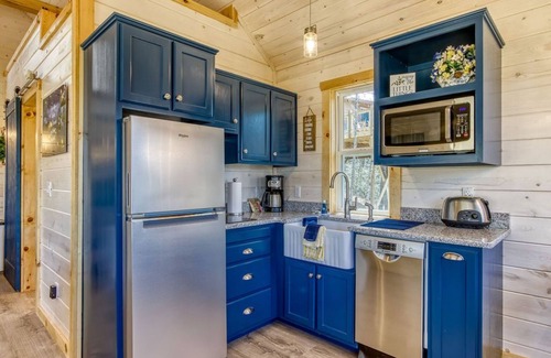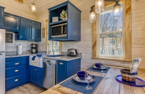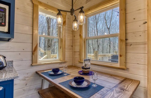 The Chasing Fireflies Treehouse features modern amenities while maintaining a nostalgic charm. Accommodating up to four guests, it includes a cozy queen bed, a sofa bed, a full-size bathroom with shower, and a kitchenette for all your culinary needs. The stunning treehouse comes equipped with air conditioning or heating to ensure comfort during every season, along with a big-screen smart TV and complimentary Wi-Fi. Outdoor living is taken to another level with spacious decks that invite you to dine under the stars or simply relax in the fresh mountain air. With over 500 feet of twinkling lights illuminating the exterior at night, this enchanting space creates a dreamy atmosphere perfect for intimate gatherings and unforgettable celebrations.