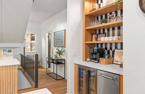Entertain in style at the custom wet bar, complete with a wine refrigerator, sink, and a unique half-moon bar top with seating. The gourmet kitchen boasts stainless steel appliances, a spacious kitchen island with seating, and everything you need for effortless meal prep or a casual gathering.