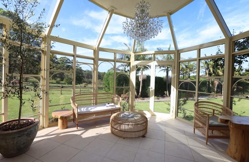 Set on twenty acres Chateau Morrow is a beautiful large French Provincial inspired home built by the owner. Architecturally designed the house has an elegant spacious interior suited to a relaxed luxurious seaside holiday. There is a large heated spa that sits alongside a beautiful pool in the backyard and large spacious verandah with entertaining area overlooking the yard.